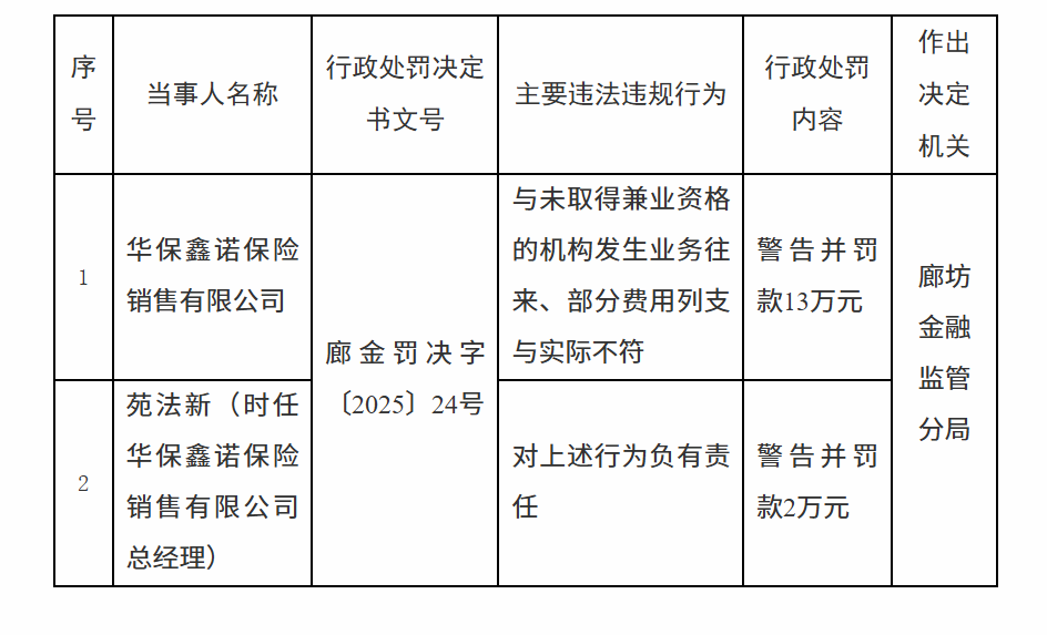 1月20日,国家金融监督管理总局廊坊监管分局行政处罚信息公开表显示,华保鑫诺保险销售有限公司因与未取得兼业资格的机构发生业务往来、部分费用列支与实际不符被警告并罚款13万元。责任人苑某新被警告并罚款2万元。